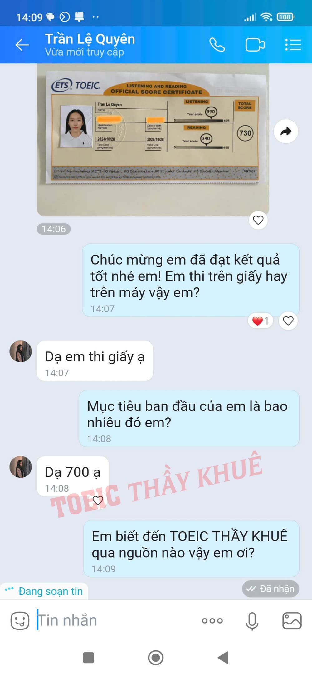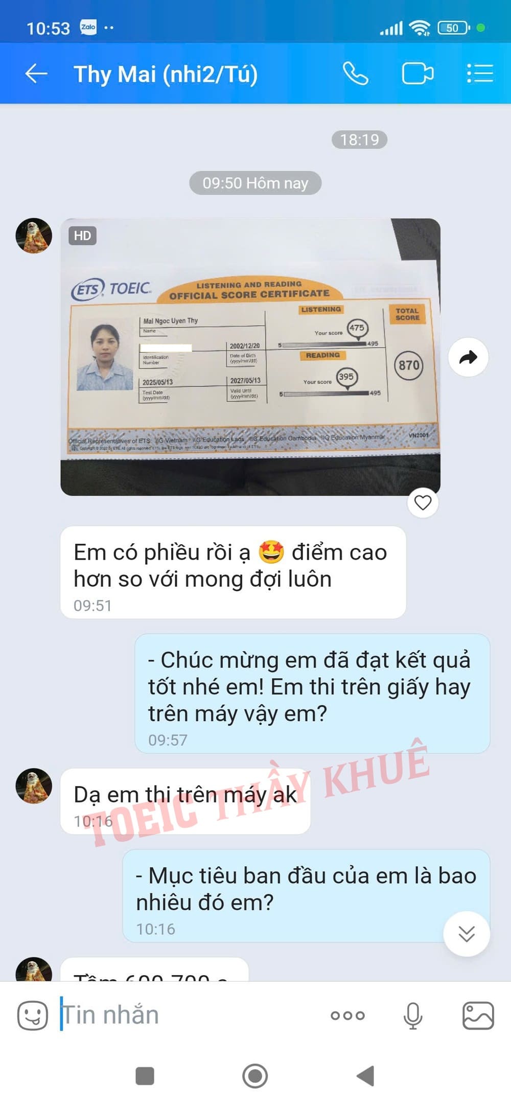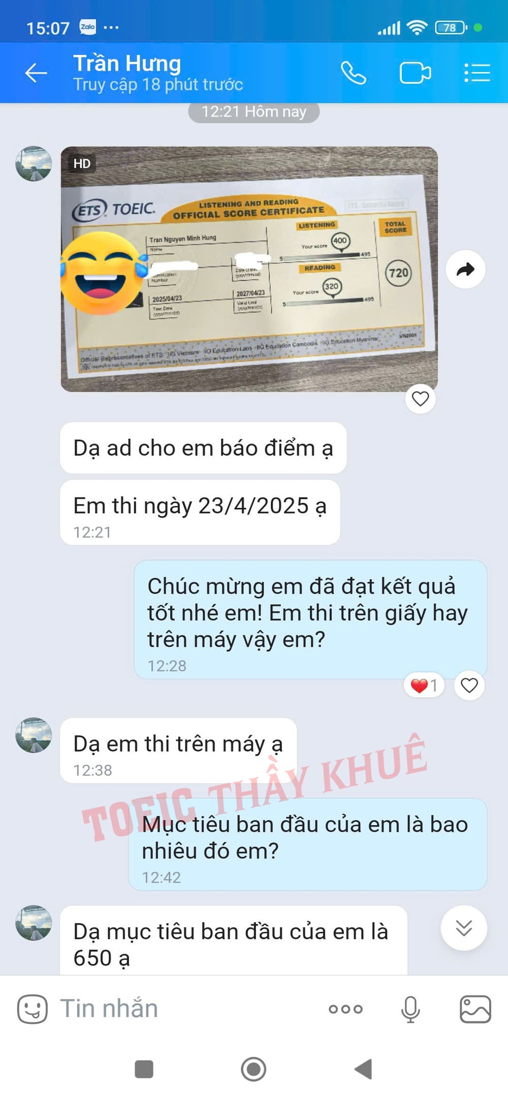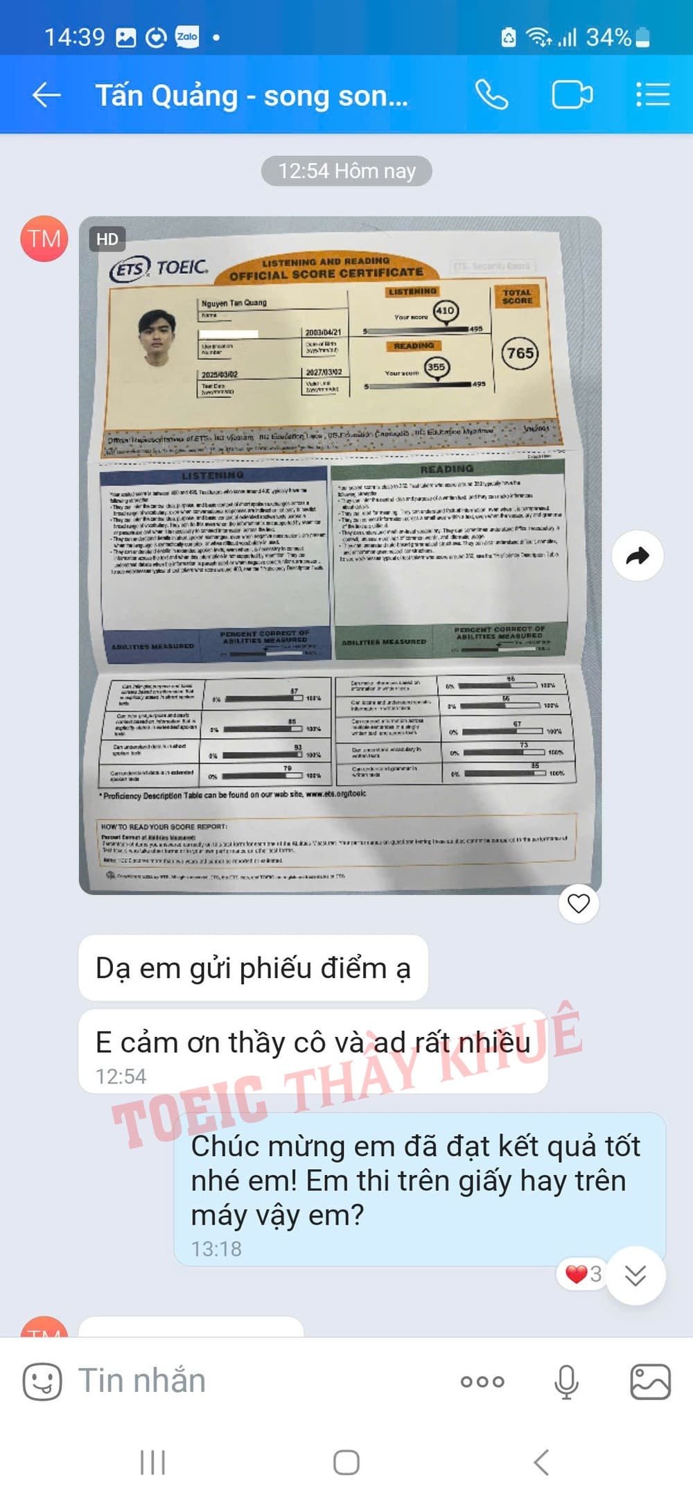 HỌC VIÊN BÁO ĐIỂM TẠI TOEIC THẦY KHUÊ